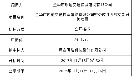 金華市軌道交通投資建設(shè)有限公司財務軟件系統(tǒng)更新升級項目中標公示