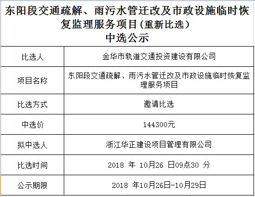 東陽段交通疏解、雨污水管遷改及市政設(shè)施臨時(shí)恢復(fù)監(jiān)理服務(wù)項(xiàng)目(重新比選)中選公示